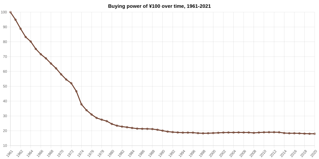 I came across this site, which is a great tool for understanding inflation. Take a look at the Japan Inflation Calculator and you can clearly see how brutal the effect of inflation has been on purchasing power here. 1 yen today is only worth 19% of a yen 60 years ago. And that is in a county that has been battling deflation for the last 30 years…