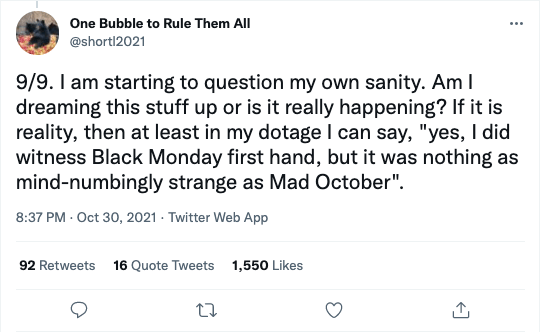 The above tweet comes from a remarkable thread by a market veteran who is trying to get his head around what happened in financial markets in the month of October 2021. Amid fears of inflation and a flurry of tech earnings reports, Tesla stock went off to the races, whilst Mark Zuckerberg renamed Facebook and launched his foray into the metaverse. Meanwhile in crypto, meme-based dog coins were off the leash and a virtual world currency suddenly woke up and went parabolic. All while the VIX, the US stock market’s “fear index” languished by the pool sipping cocktails.