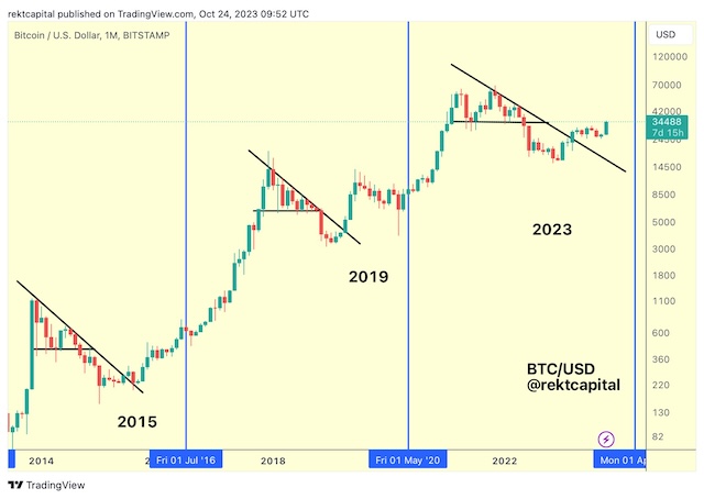 The catalysts for the bear/bull phases of each cycle change over time. The breakout this week was fuelled by one that is long overdue: the prospect for approval of spot Bitcoin ETFs in the United States. Yes, despite many other countries already approving ETFs that hold actual Bitcoin in their portfolio, the Securities and Exchange Commission in America has been dragging its feet on this one. I don’t fully understand the reason for its reluctance but it seems to be political. Elizabeth Warren in particular has it in for crypto and loves to bypass reality in claiming that every bad thing has been funded by this shady new asset class. (and not the US dollar…) The SEC has approved futures-based ETFs that track price changes by buying and selling derivative contracts but has stubbornly rejected all applications for a spot ETF. However, that may be about to change. Grayscale took the SEC to court over its ‘arbitrary and capricious’ rejection of the conversion of the Grayscale Bitcoin Trust to an ETF and won. The D.C. Circuit Court of Appeals closed the book on this case on 23 October and now the SEC has to find another excuse to deny or it has to approve. Also lined up, waiting for approval are names like Blackrock, Invesco and Fidelity. These big players will bring significant demand to an asset with a fixed supply. The funny thing is, the SEC could have approved spot ETFs in the depths of the bear market and no one would have cared. By delaying for this long, the SEC may find itself forced to approve ETFs right as the new bull market begins, unwittingly cranking the volume to 11.
