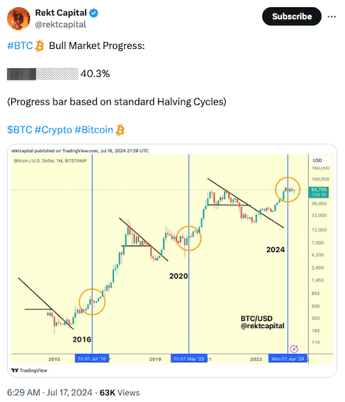 So, to sum up, we’ve got an asset that has been through three consecutive 4-year bull/bear cycles and is potentially 40% of the way through the current bull phase. We’ve got a bullet-dodging potential US President speaking at a Bitcoin conference. We have the kings of fiat finance changing their tune. And JPow is about to cut rates.