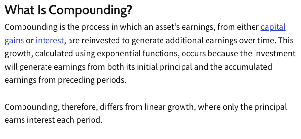 Here’s the Investopedia definition of compounding: