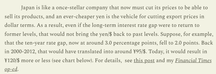 I have re-read this excellent post by Richard Katz several times: The BOJ, the Fed and The Future Of The Yen. He notes that although the gap between US and Japan overnight rates may close, the gap between the two countries’ long-term yields is unlikely to follow suit, meaning the yen probably won’t recover as strongly as some think it will. Here’s an excerpt from that piece: